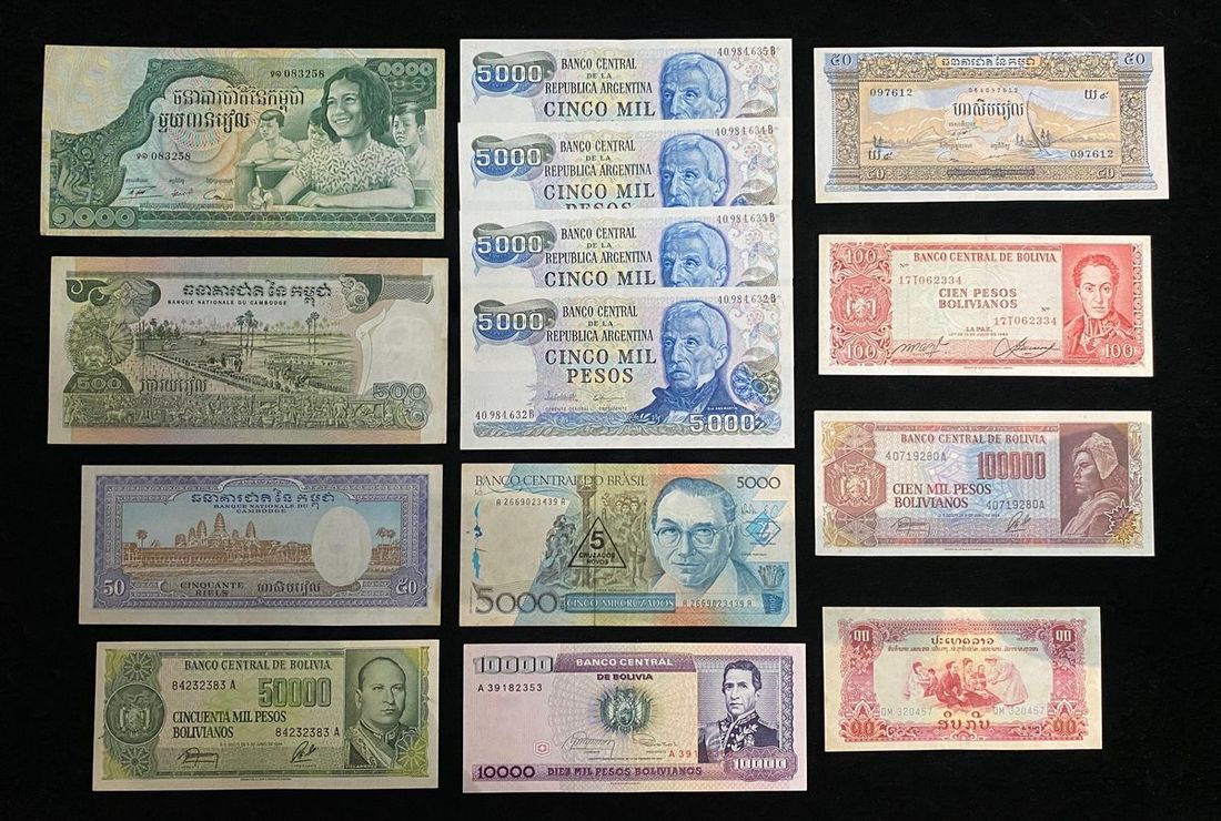 World Banknotes, a group of 14x, including: Bolivia, 50000, 10000 and 100000 bolivianos, 1984; Bolivia, 100 bolivianos, 1962; Laos, 10 kip, ND (1968); Brazil,