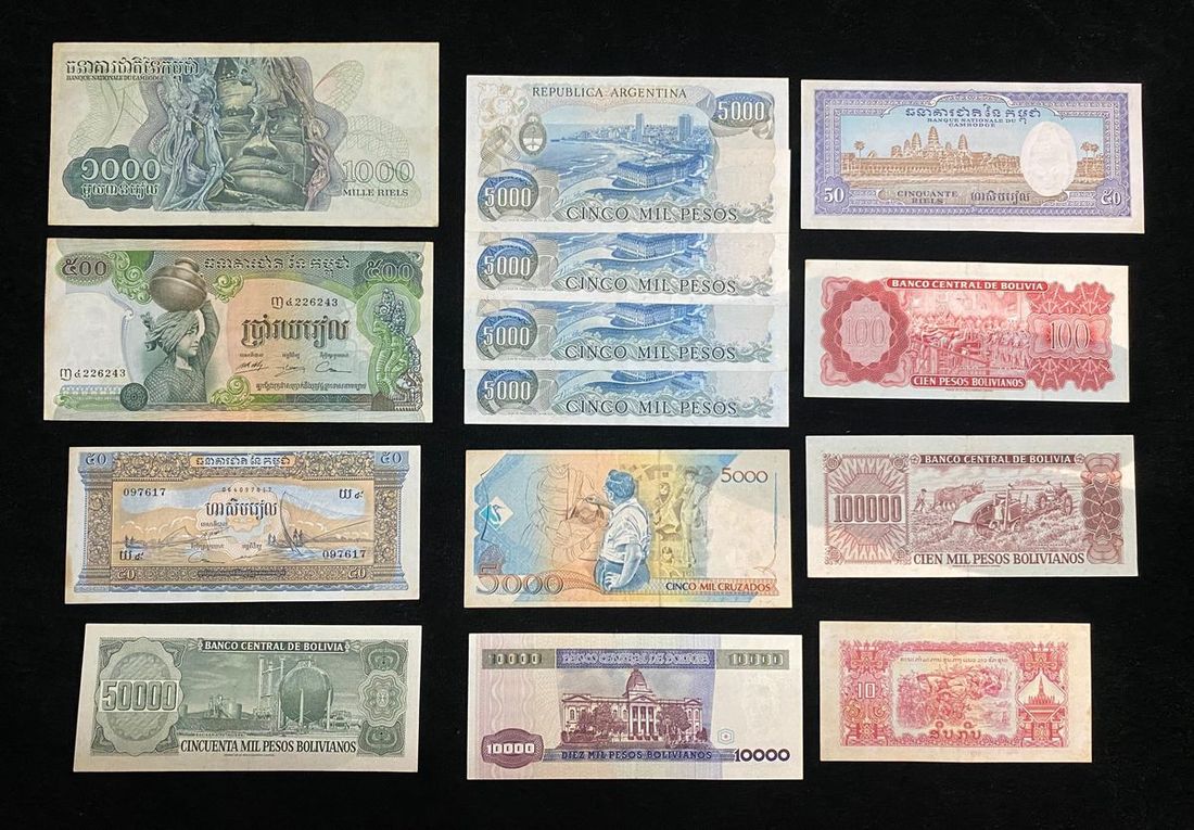 5 cruzados novos, ND (1989); Cambodia, 50 riels, ND (1956-1975); Cambodia, 1000 riels, ND (1973), unissued; Argentina, 5000 pesos, ND (1977-1983);