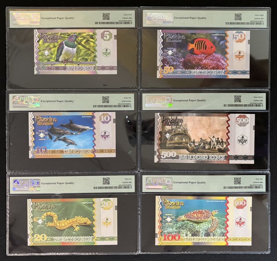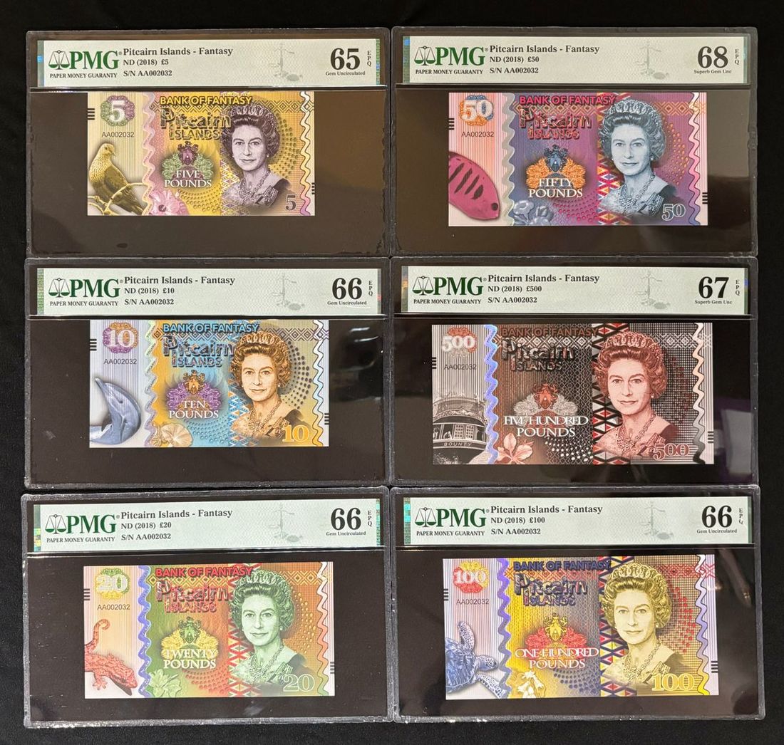Pitcarin Islands, Fantasy Issue, a set, including £5, £10, £20, £50, £100 and £500, ND (2018), PMG 65EPQ to 68EPQ (6)