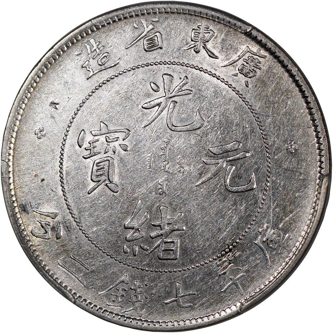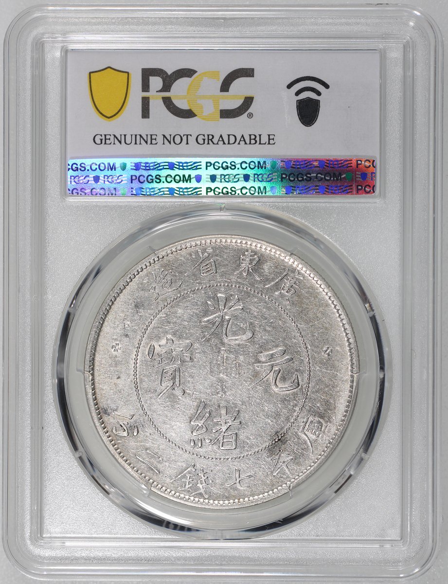 廣東省造光緒元寶庫平七錢二分,火上帶點,庫字不連筆,PCGS XF Detail,背面有打戳
