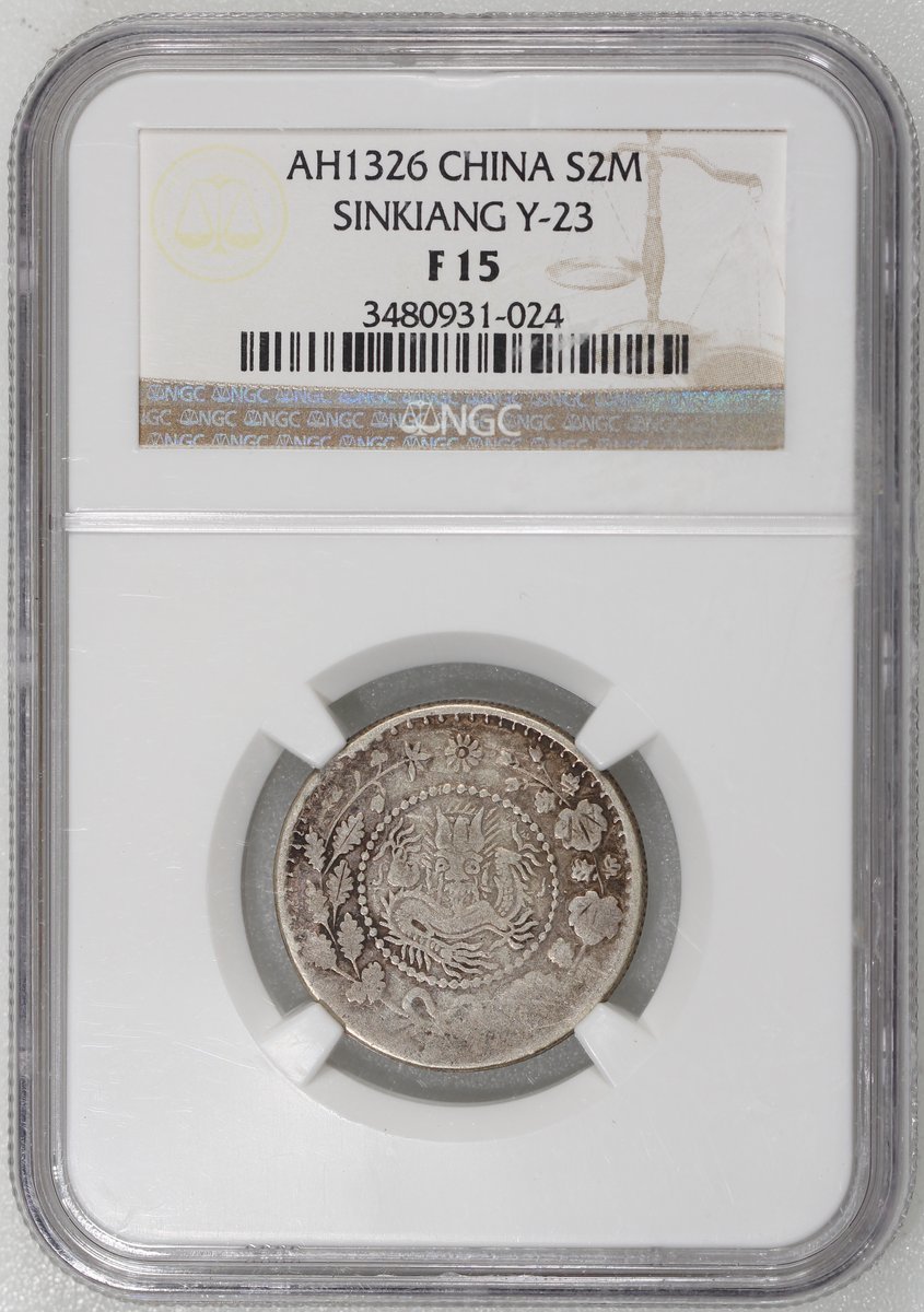 China, Qing Dynasty, Sinkiang Province, [NGC F15] silver 2 mace, AH1326 (1907), Kashgar Mint, (LM-749, Y-23), #3480931-024