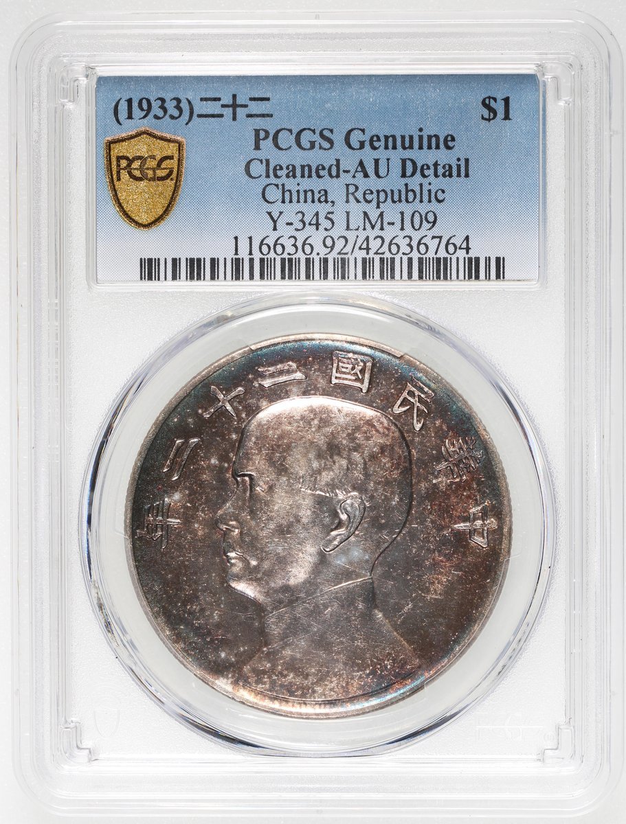 China, Republic, [PCGS AU Detail] silver dollar, Year 22 (1933), 'Junk Dollar', Cleaned, (Y-345, KM-109), cert. #42636764, dark toning.