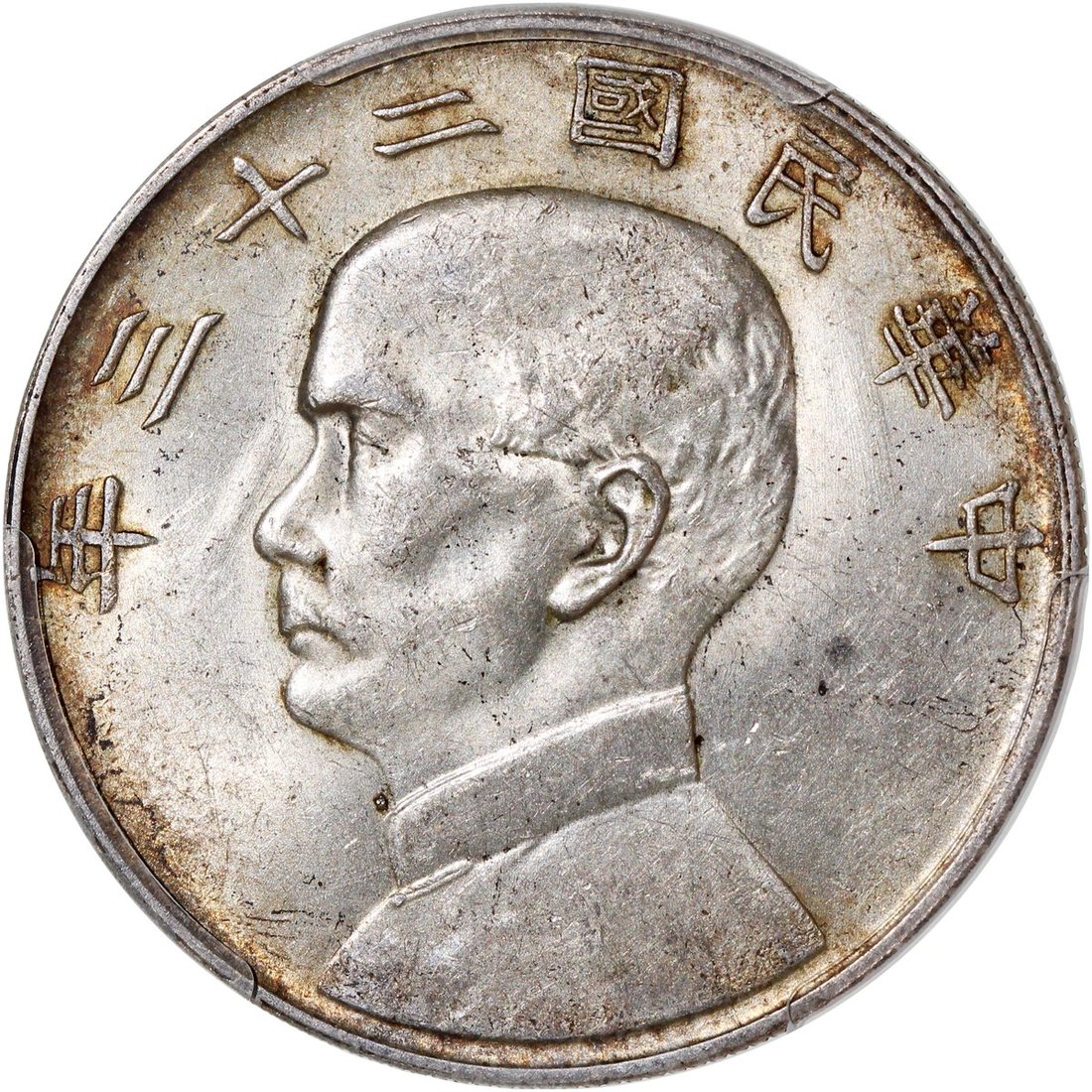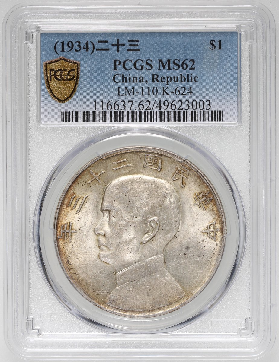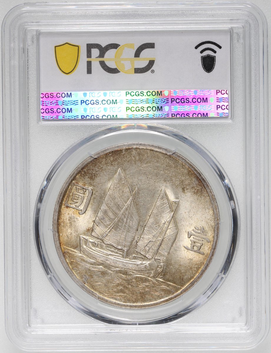 民國二十三年孫像船洋壹圓,PCGS MS62,領子帶點,有均勻金色包漿