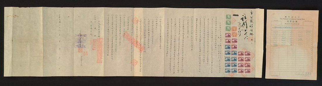 unusual and interesting, with coal being a major component in the minting process and the contract states the value being worth 37680 yuan. Contract has splits at right, some stains; radio telegram has staple holes at top left, both Choice Very Fine (2)