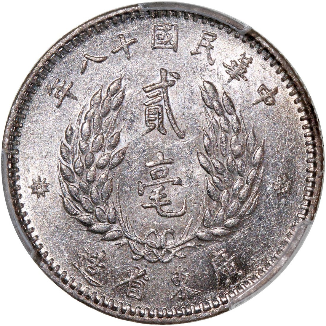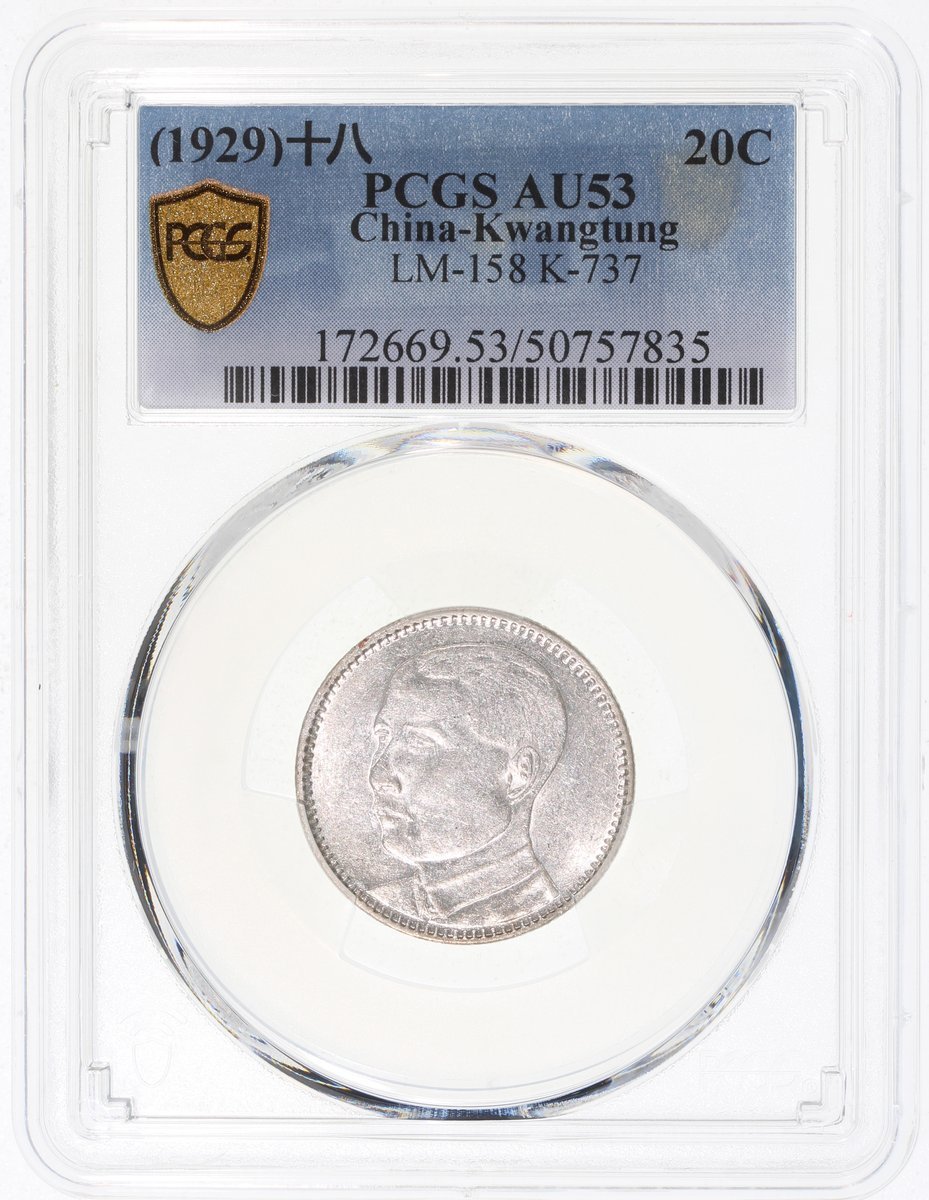 China, Qing Dynasty, Kwangtung Province, [PCGS AU53] silver 20 cents, Year 18 (1929), #50757835