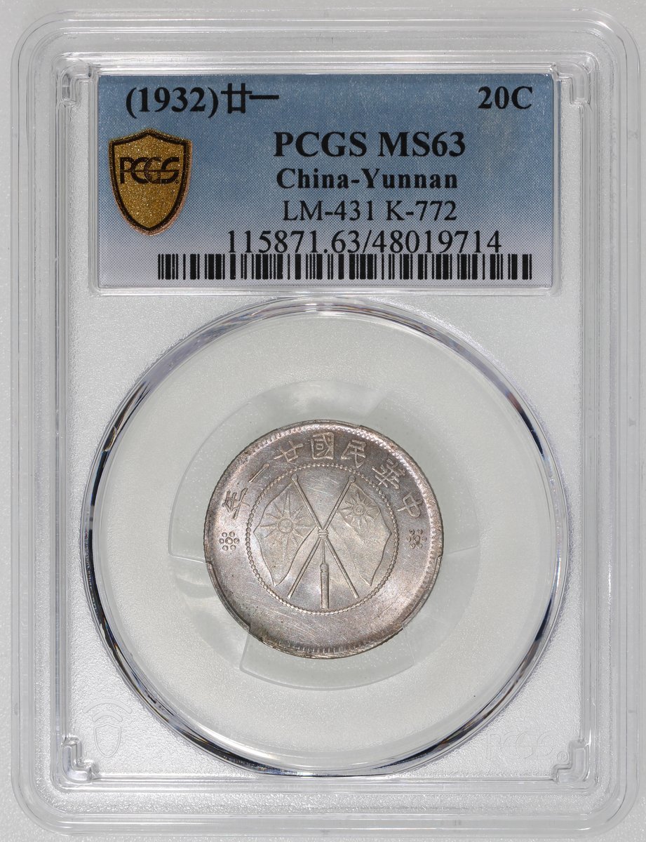 China, Republic, Yunnan Province, [PCGS MS63] silver 20 cents, Year 21(1932), crossed flags on obverse, (LM-431), PCGS MS63. Cert.# 48019714