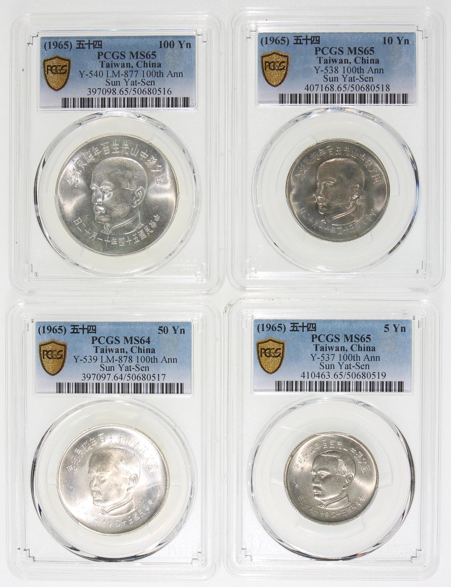 Taiwan, [PCGS MS64-65] commemorative set of the Centennial Birthday of Dr. Sun Yat Sen, including 5, 10, 50 and 100 yuan, #50680519 / 518 / 517 / 516 (4)