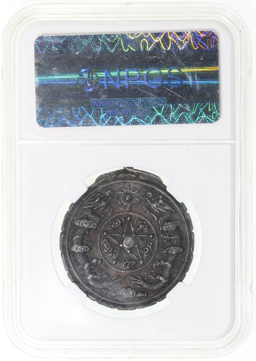 China, Qing Dynasty, Kwangtung Army Surveying School silver graduation medal, 1906-1911, a Qing Dynasty issue as the school was later renamed. Intricate high relief design with double dragons rising in foliage-like clouds towards a fiery pearl, five-pointed star at centre. Graded by NPGC as Genuine, alluring dark rainbow toning