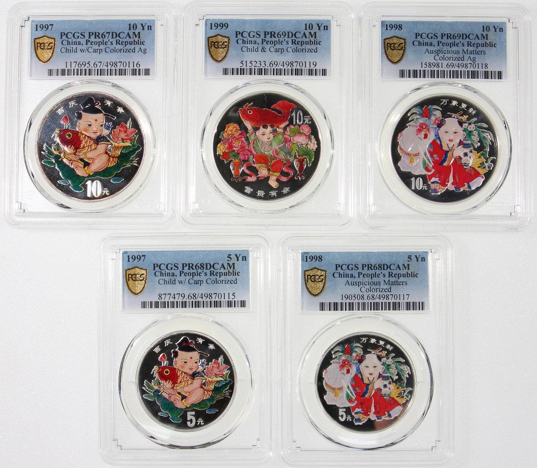 People's Republic of China, [PCGS PR67-69DCAM] a group of 5x colourised silver Auspicious Matters proofs, including: 1997 5 yuan and 10 yuan, 'Ji Qing You Yu', child with carp; 1998 5 yuan and 10 yuan, 'Wan Xiang Geng Xin', child with elephant; 1999 10 yuan, 'Fu Gui You Yu', child with carp and flowers; ASW 4oz, graded PCGS PR68DCAM, PR67DCAM, PR68DCAM, PR69DCAM and PR69DCAM respectively, cert. #49870115-19 (5)
