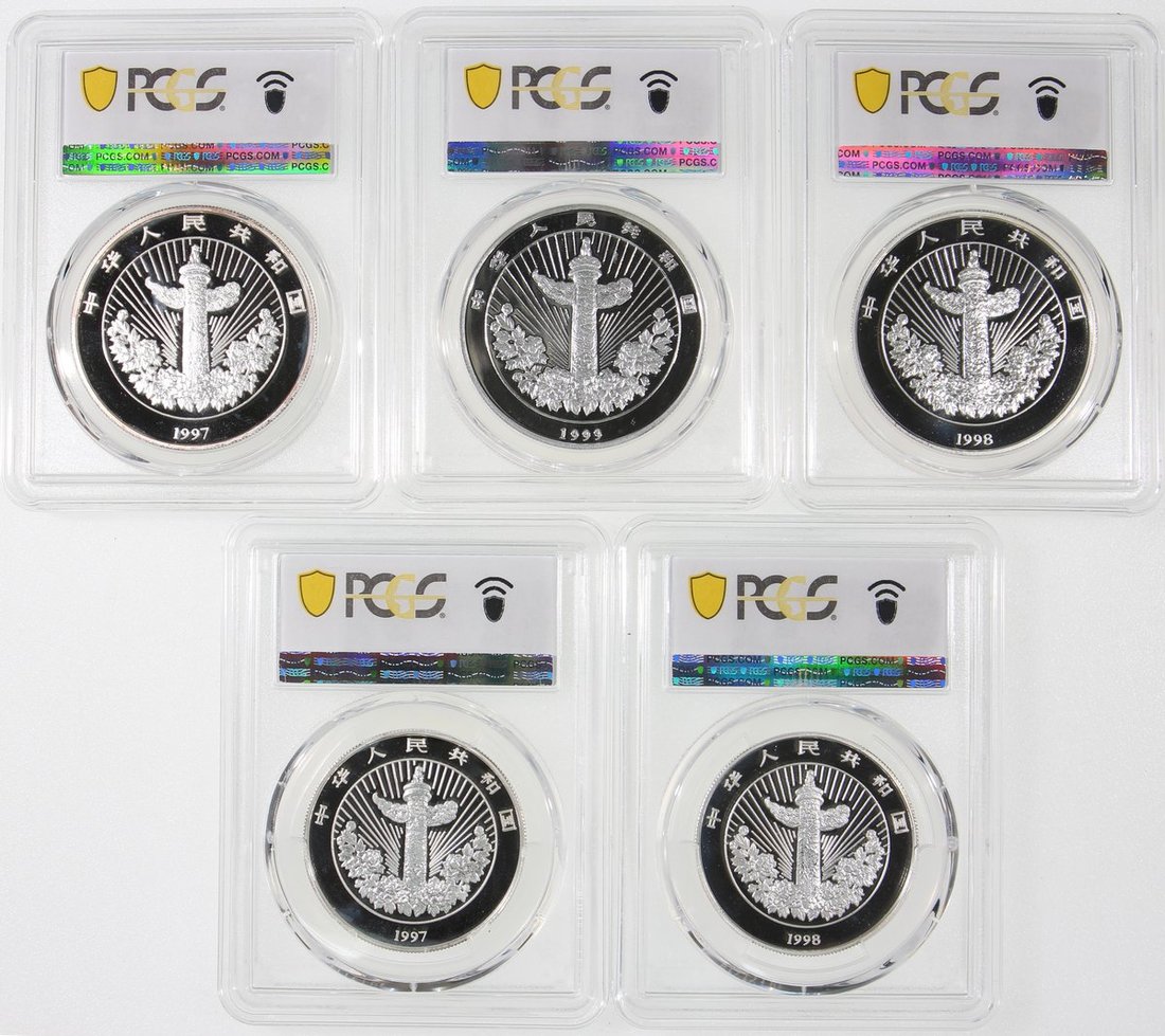 中國彩色吉祥圖案精鑄銀幣一組5枚,包括1997年5元及10元“吉慶有餘”,1998年5元及10元“萬象更新”,1999年10元“富貴有餘”,總銀含量4盎司,跟別評級為PCGS PR68DCAM,PR67DCAM,PR68DCAM,PR69DCAM及PR69DCAM