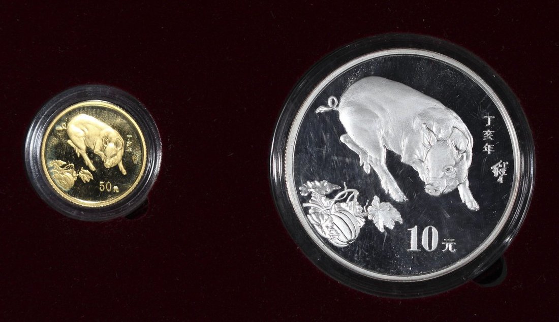 People's Republic of China, a set of proof gold 50 yuan and silver 10 yuan, 2007, commemorative of the Year of Pig, with original certificate and wooden box, uncirculated.(2)