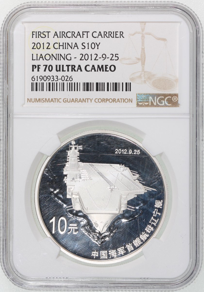 People's Republic of China, [NGC PF70 Ultra Cameo] silver proof 10 yuan, 2012, First Aircraft Carrier commemorative issue, 'Liaoning 2012-9-25', ASW 1oz, cert. #6190933-026, with original certificate of issue