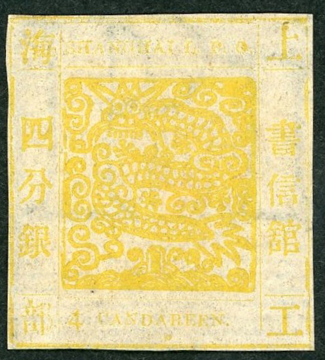 1865 Antique numerals, Candareen in the singular on wove paper, 4ca. yellow, printing 27a, with paper-marker's watermark, small margins, fine unused, some adherences at centre. A very rare stamp, only one recorded by Dr. Wei-Liang Chow.