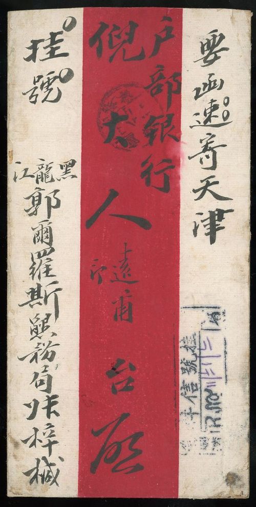 1907 (4 Sep.) registered red band envelope to Tientsin (8.9) bearing CIP 2c. and 5c. tied by Harbin lunar c.d.s., both side showing framed registration handstamp, fine.