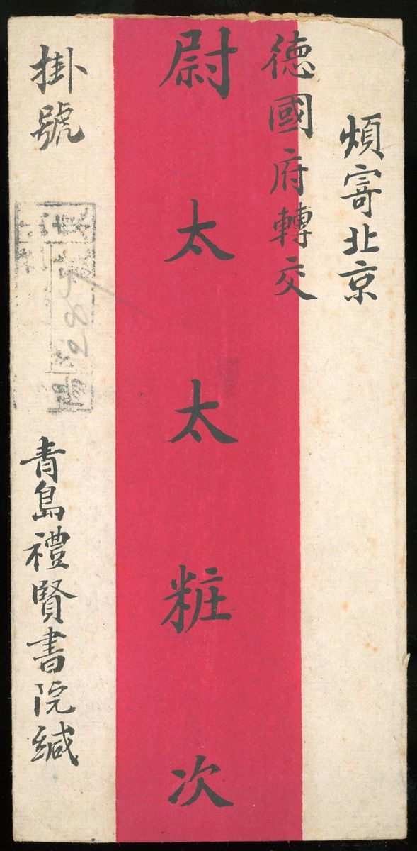 1908 (10 Mar.) registered red band envelope to Peking bearing CIP 2c. block of four and 5c. tied by Chengyang lunar c.d.s., and Tsinan transit c.d.s., on front, showing framed registration handstamp, fine.