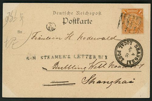 1902 (16 April) picture postcard of the 'S.M.S. LUCHS' written on board the S.M.S. LUCHS addressed to Shanghai bearing CIP 1c tied by pakua cds with adjacent Shanghai Local Post cds and hand-stamped 'From Steamers Letter Box' and postman's chop 'C/25' on front.