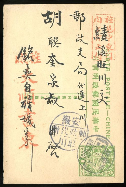 1915 (?) 1c. card to Chiki tied by Tsingteh c.d.s, showing "Anhwei/Postal Agency/Wangchwan" single-ring in black, fine.