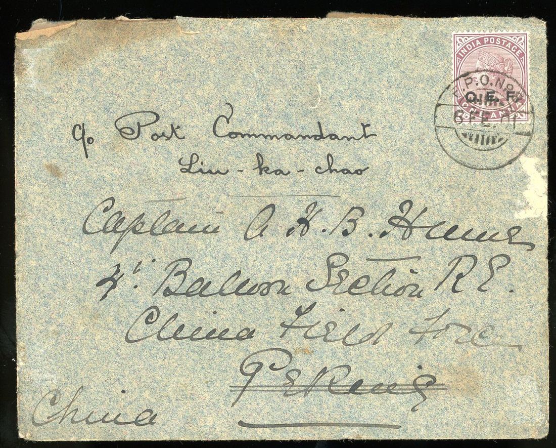 1901 (6 Feb.) envelope addressed to Captain A.H.B. Hume, 4th Balloon Section R.E., China Field Force, Peking bearing C.E.F. 1a. tied by F.P.O. No.4 c.d.s. and redirected "c/o Post Commandant Liu-ka-chao", the reverse bears an array of F.P.O. datestamps for numbers 1, 2 and 5 along with a very fine strike of the large double-circle "