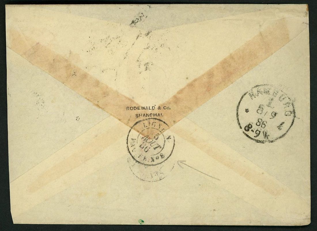 1886 (30 July) cover to Germany bearing French Type Sage 25cts tied by 'Shanghai/Chine' double ring cds (Pothion T84) with normal cds adjacent, endorsed 'Per French Mail' with 'Ligne N Paq. Fr No8/5 August' cds and Hamburg arrival on reverse.