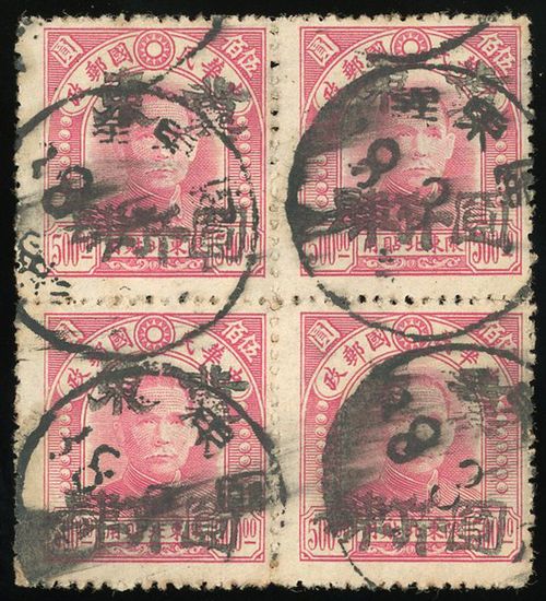 1949 (Jan.) Tangshan 2nd handsurch. on SYS with "Ki Tung" and new value, rubber chop with wide space $4000 on $500 rose, block of four, used, fine. Yang NC134