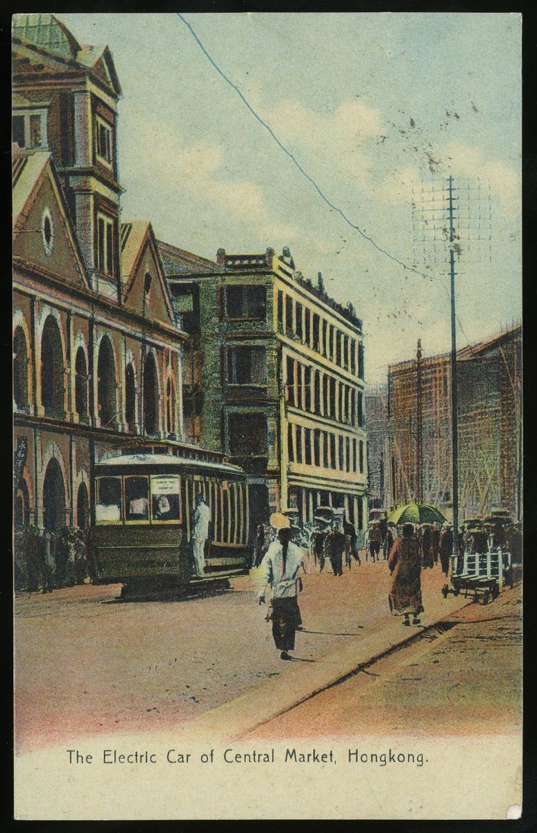 1900年代香港德輔道中環街市及第一代電車的明信片.