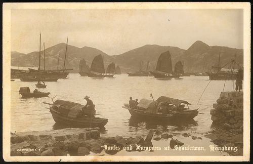1920s-1930s a real photo postcard of the sampans and Junks at Shau Kei Wan, Hong Kong.