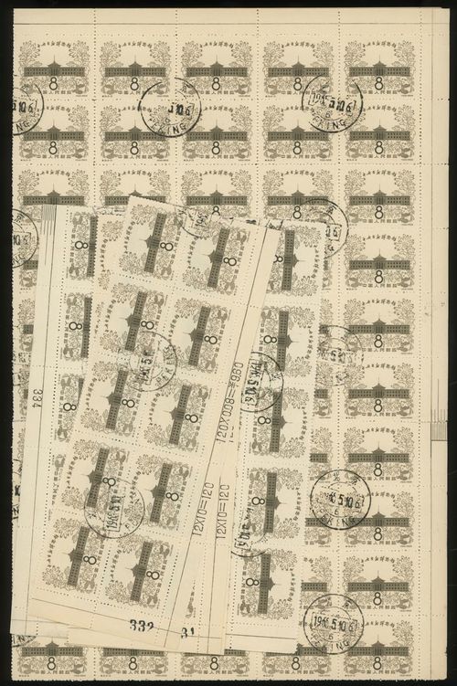 1957 Central Museum of National History (S31) (2-2) 8f with block of 100, block of 40 and block of 20 x 2. Total 180 pcs. All with margin, block of 100 & block of 40 with ball pen writing at margin. 8001000