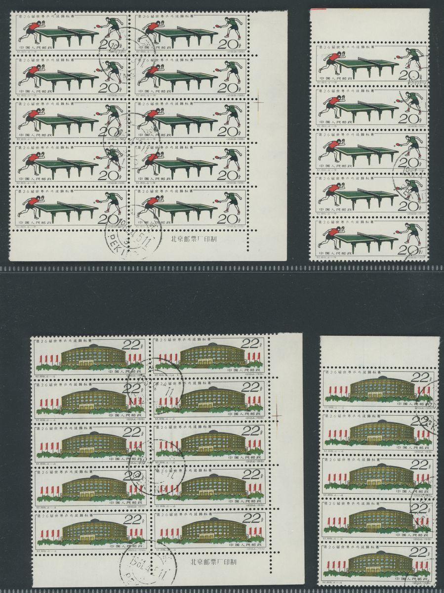 1961 (C86) Table Tennis complete set of 4 in strip of 5 and lower right corner block of 10, CTO and gum toning. 8001000