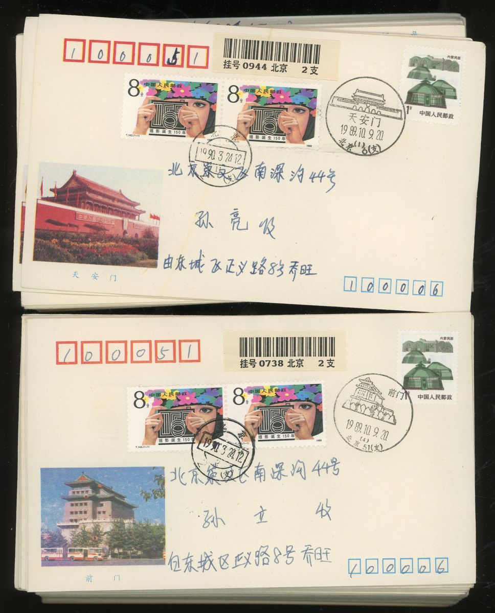 1989 (9 Oct.) A mixed franking of the 89-10 envelop registered to Beijing locally,, bearing R23 1f and T142 in pair, both tied by ‘BEIJING’ cds, 190. 500600