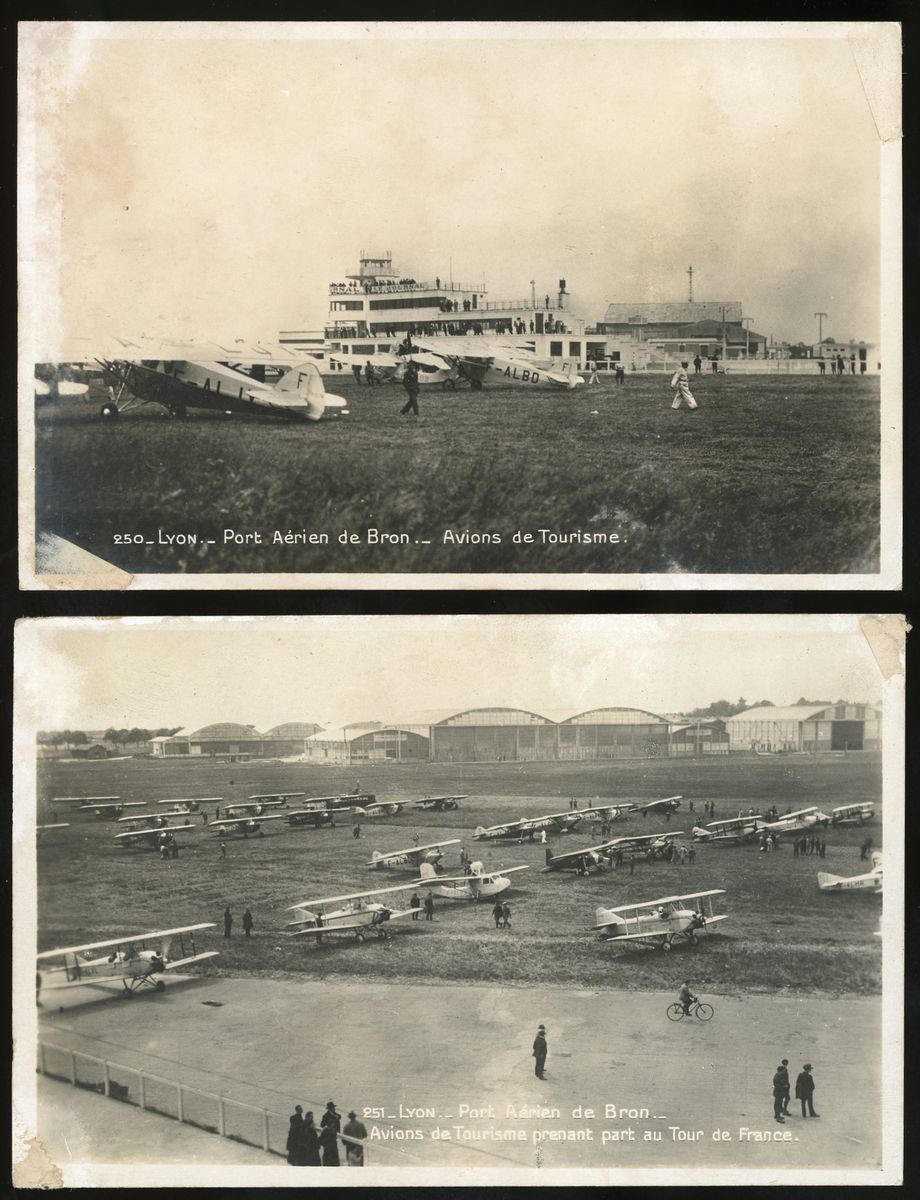 1920s two real photo postcards of the sightseeing aircraft exhibition at Lyon Airport, France.