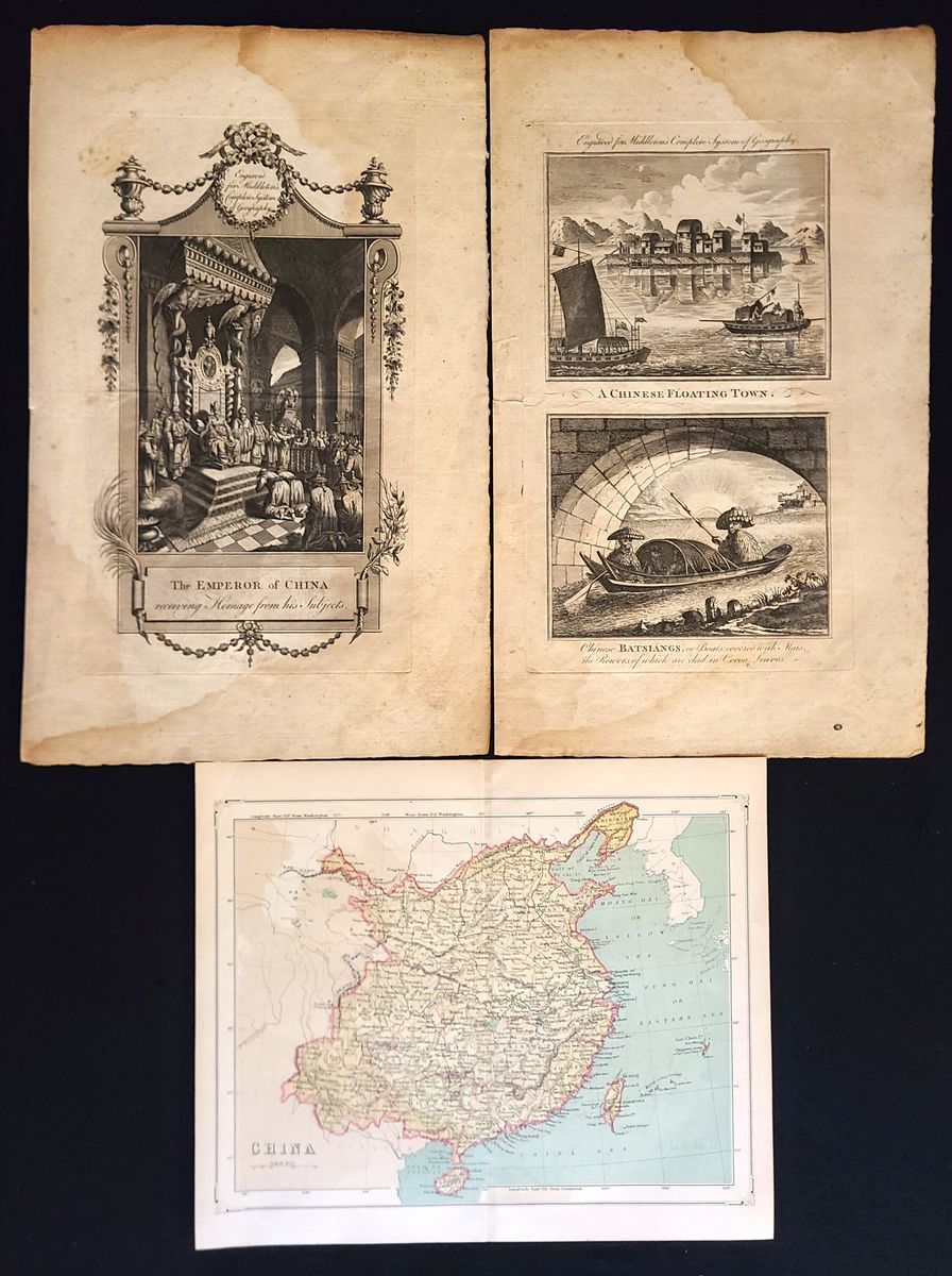 1777 &1778年中國題材銅版彫刻印刷插畫两幅 (每幅 24x38cm), 均有水漬痕 , 取自"A New and Complate System of Geography" 一書中; 另有約1900年代中國地圖一幅 (25x30cm)