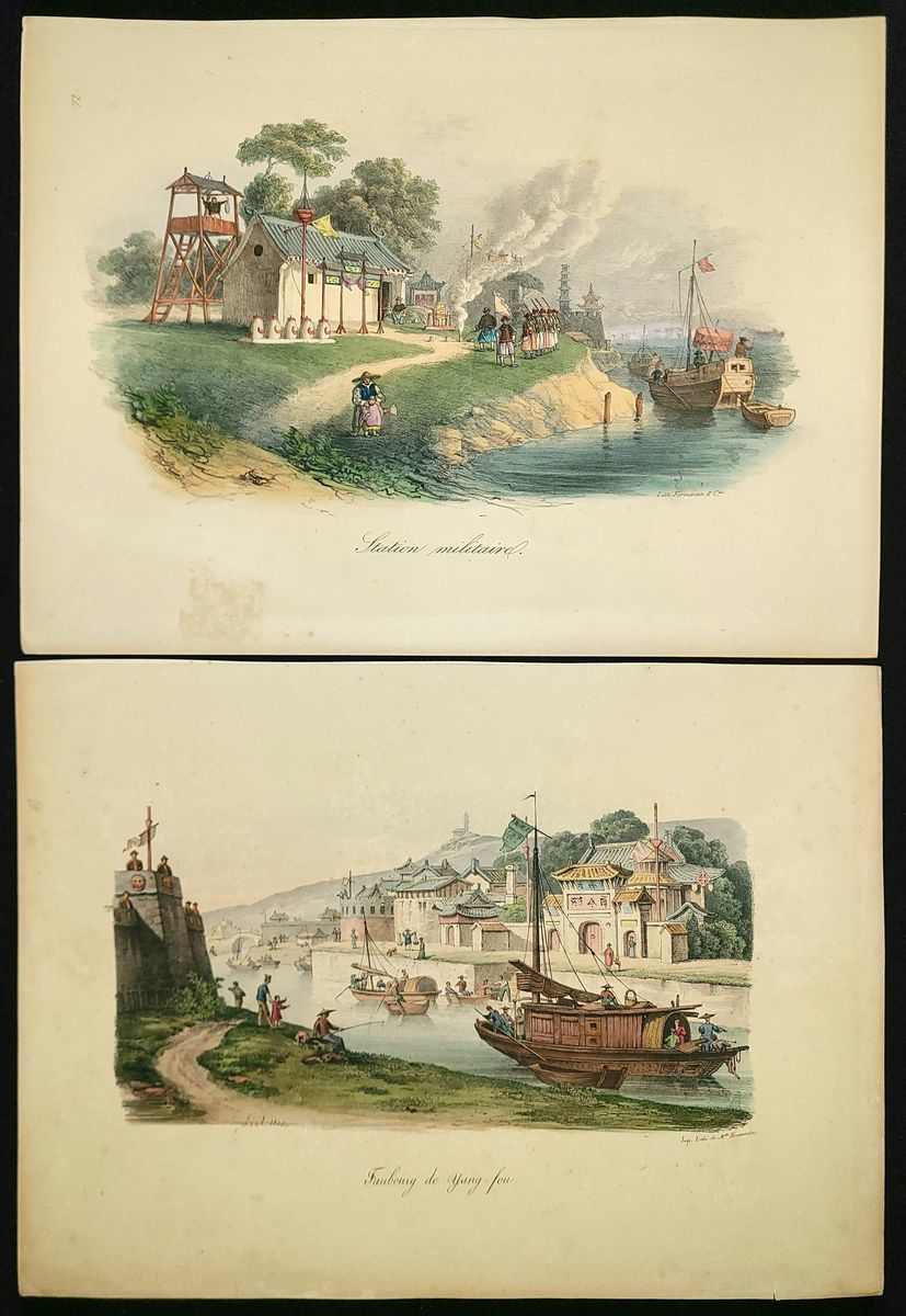 1830s-1840s two lithograph color prints of landscape paintings of the China, depicting the Qing military camp and Yang-Fou (location unknown). Both sizes are 24x33cm.