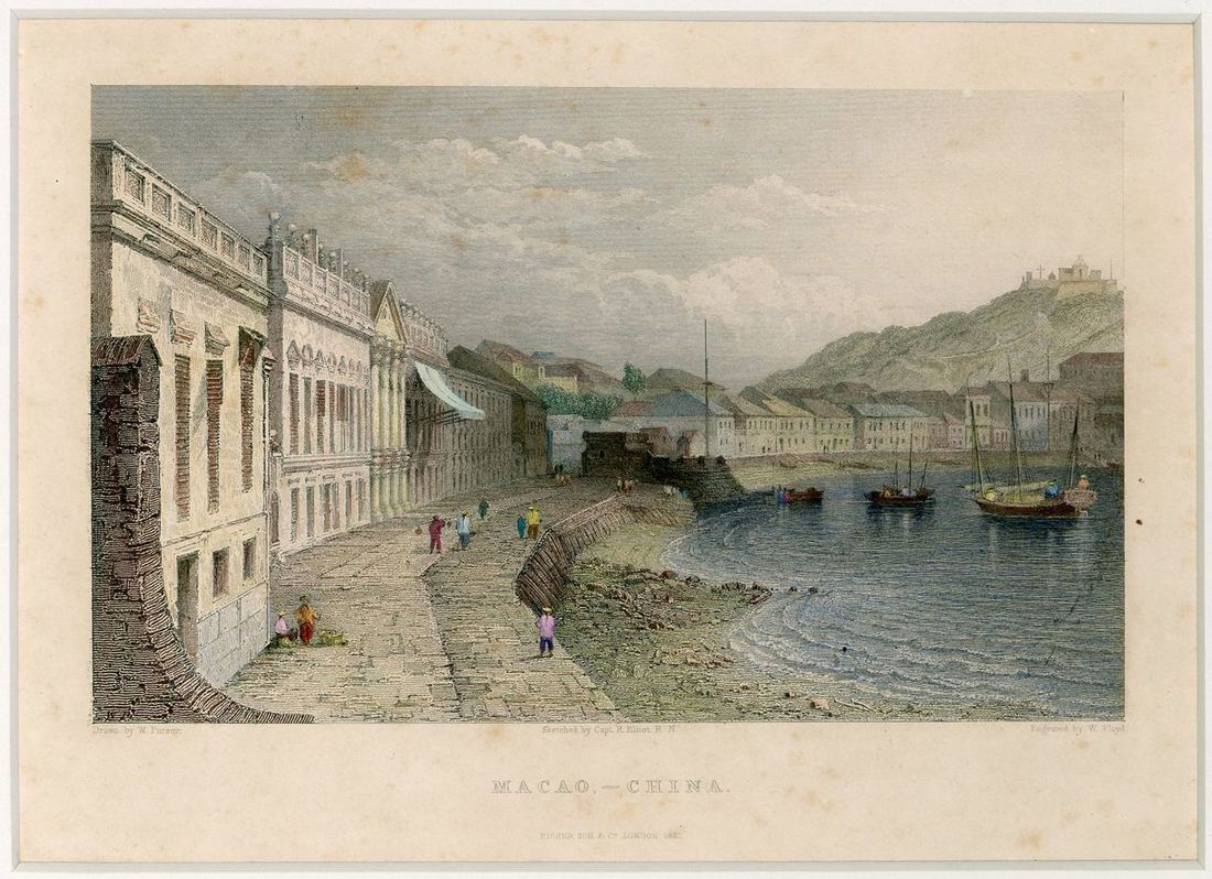1832年"澳門-從南灣遠眺東望洋山" 彫版畫, 手工上色, 倫敦Fisher Son & Co. 出品, W. Furser 繪圖及W. Floyd 彫刻. 已裝裱於硬卡紙上, 畫幅尺寸: 15.2x21cm