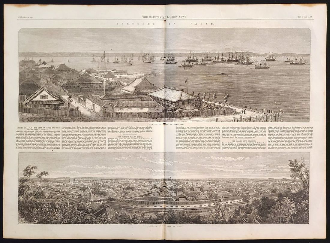 1864年英國 "The Illustrated London News" 刊印日本風景大幅彫版畫, 畫幅橫跨两頁. 上幅是橫濱的英國艦隊, 下幅是江戶 (即今東京)全景. 刻印精細. 尺寸: 40.2x57cm