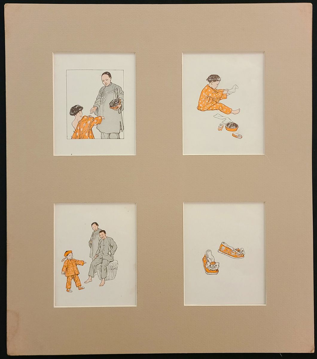 1920-1930年代中國人物石版畫四小幅, 已裝裱於同一咭紙中. 全幅尺寸: 33.5x38cm