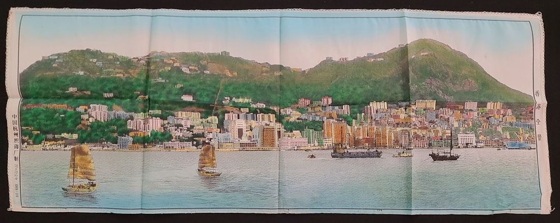 1950-1960s a panoramic fabric on the north shore of Hong Kong Island. Made by Hangzhou Brocade Factory in China and colored by hand. Well preserved. Size: 28x73cm