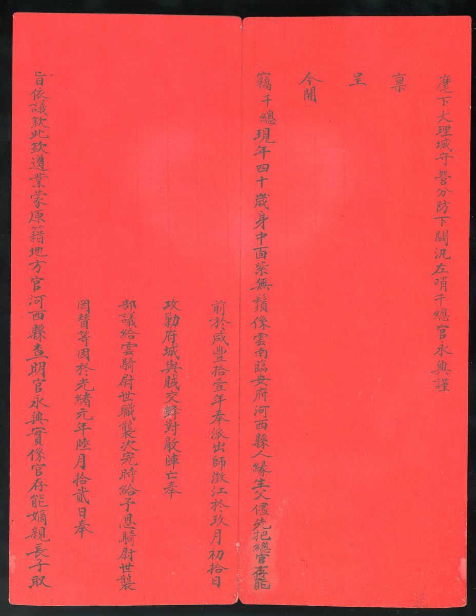 1875-1908 清朝光緒年間手寫呈上折叠式的軍職履歷一帖, 面及底為黑色底帶人物圖案的壓花, 內裏為紅地墨字, 楷書小字異常工整. 極具收藏與欣賞價值. 尺寸: 107x23cm
