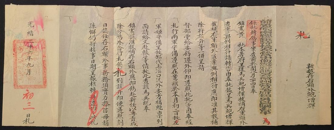 1900年 (光緒二十六年) 徽州營參府批准下屬呈請抜補軍籍空缺的手公文一份, 末端蓋有朱色大官印一枚及有朱批.