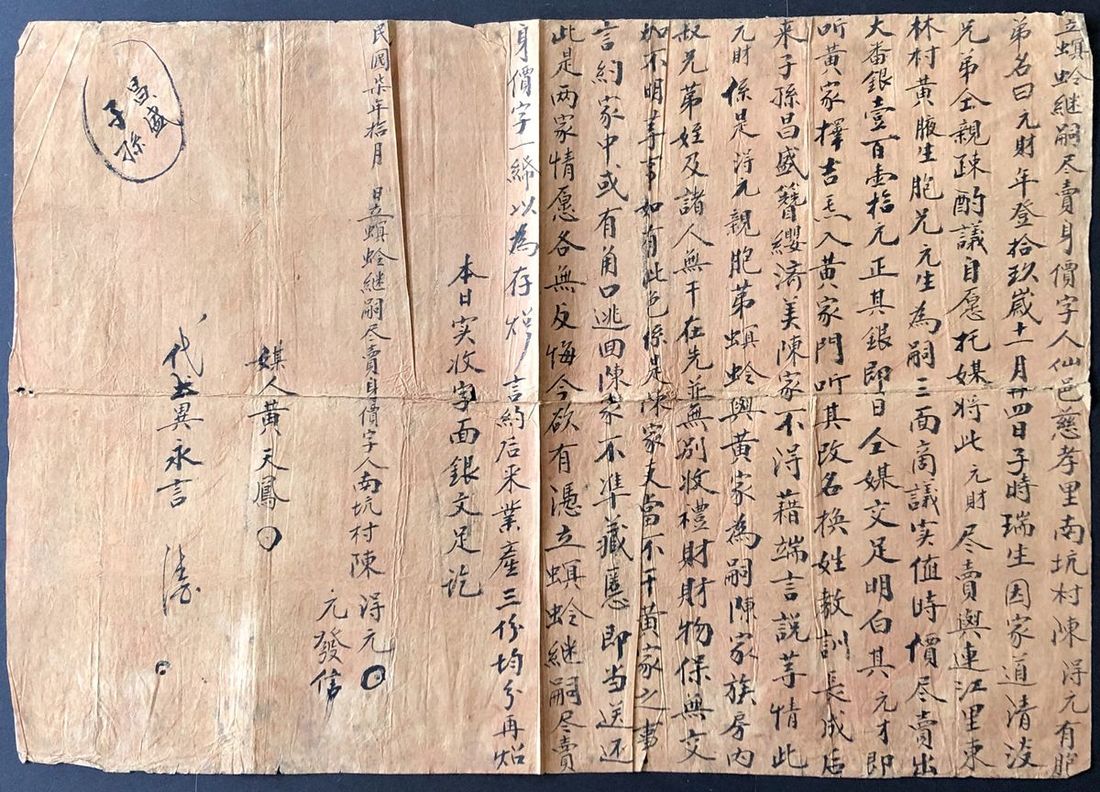 1918 a handwritten deed of selling a litter brother. In the early years of the Republic of China, the warlords fought each other and the people were living in poverty, so selling children was a common thing, but a deed of selling a brother was relatively rare.