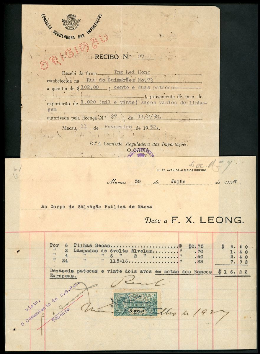 1927 he shopping receipt of the Macao Rescue Team and the receipt issued by the Macau Import Supervision Committee in 1952.