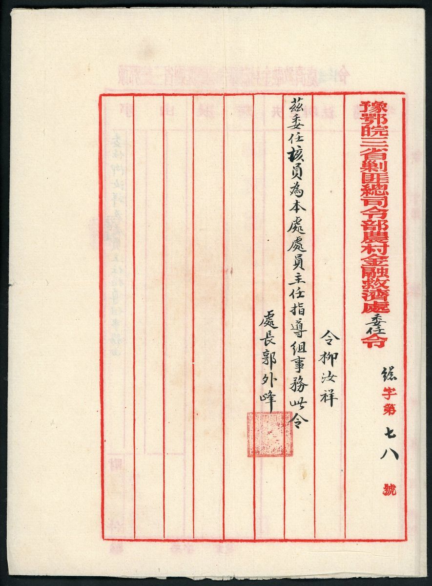 1932年 (民國二十一年) 豫鄂皖三省剿匪總司令部農村金融救濟處的委住令, 總字第七十八號, 蓋有該處的關防官章及核對印章, 紅軍時期文物, 少見.