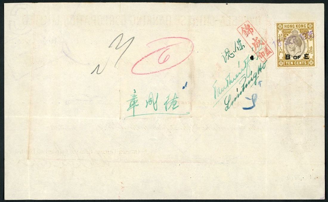 1935 Draft from Overseas Chinese Banking Corporation Limited, Hong Kong to Amoy, with B of E tax stamp 10c. on the reverse side.
