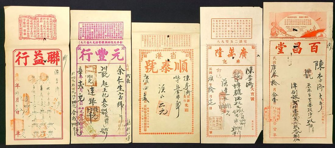 1940年(庚辰)香港戰前老單據五件, 都以毛筆書寫內容, 並蓋有多枚商家圖章. 商號包括元豐行, 廣萬隆, 聯益行, 順泰號及百昌堂等.