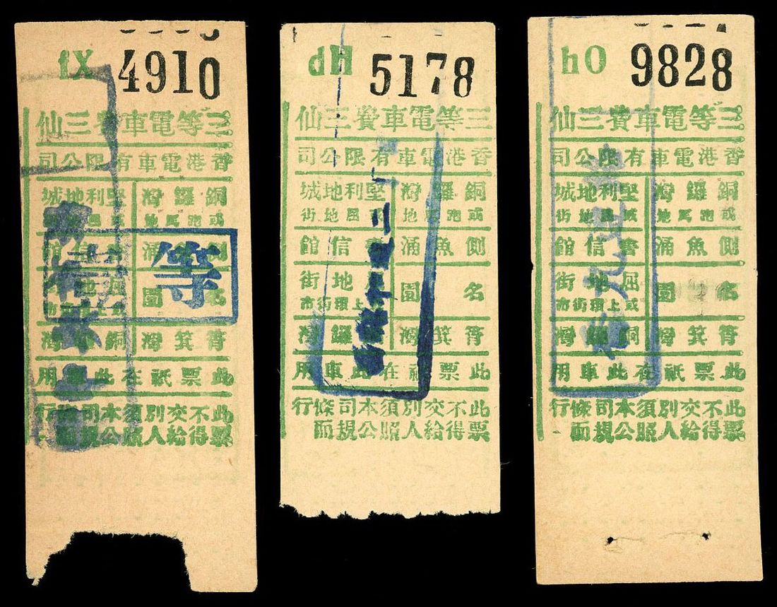 1942-1945 three tram tickets from the Japanese-occupied Hong Kong period, with "Nishi Showa-dori 2-chome", "Hong Kong-Kowloon Link" and "Central Market" stamped in blue respectively. The back of the ticket is printed with promotional or reminder sentences in Chinese and English in green. Japanese occupied tram tickets have now become a treasure for tram ticket collectors.