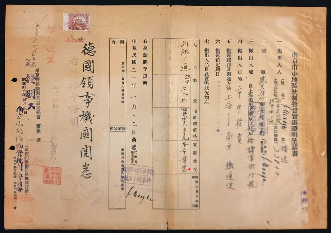 1943 a sheet of the application of puppet Nanjing City Material Control Certificate. This document was circulated and reviewed by the German consular authorities and the Nanjing secret service.