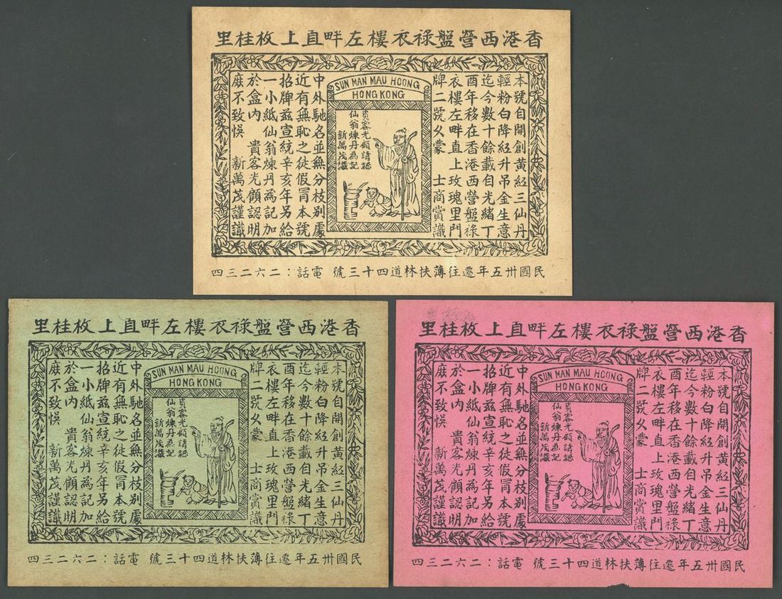 1950s three small advertisement leaflets of Hong Kong Sun Man Mau Pharmaceutical Factory, in red, white and green, with the same design.