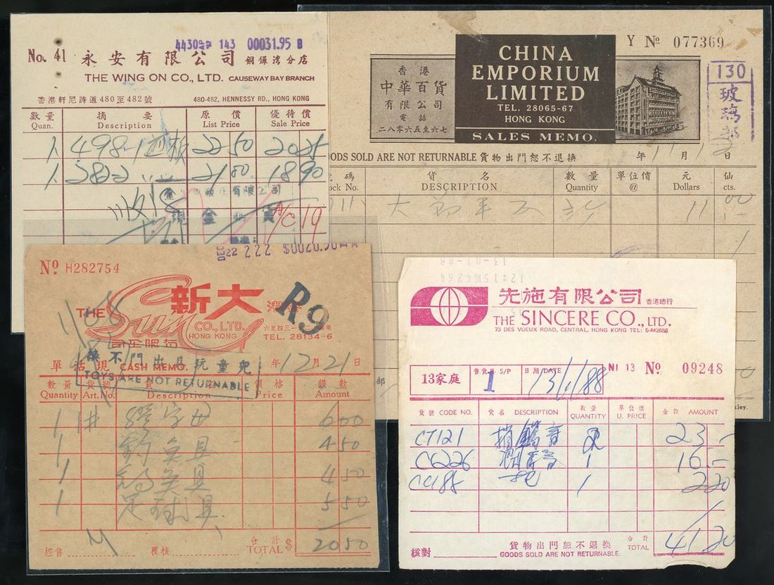 1950s-1980s receipts from the four major department stores in Hong Kong, including Wing On, The Sun, China and Sincere. It is a rare opportunity to collect receipts from the four major department stores at one time.
