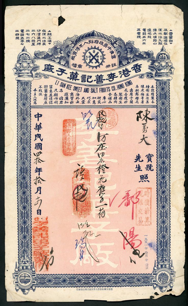 1951 a receipt from Li San Kee Sweet and Salt Fruits Factory in Hong Kong. The design is full of popular styles of the time, with multiple business seal on it, and written with a brush.