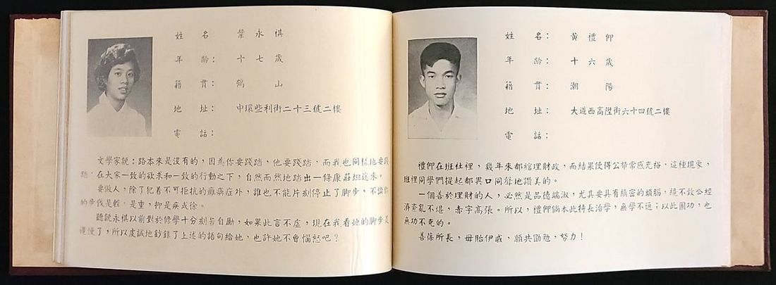 1955 a alumni directory of all the graduates of Hong Kong Fang Lam Middle School. This school was founded in 1923 and is located in Po Hing Fong, Sheung Wan. Famous alumni include businessman Wai Kei Shun, artist Chen Youhou, and Tam Ping Man.