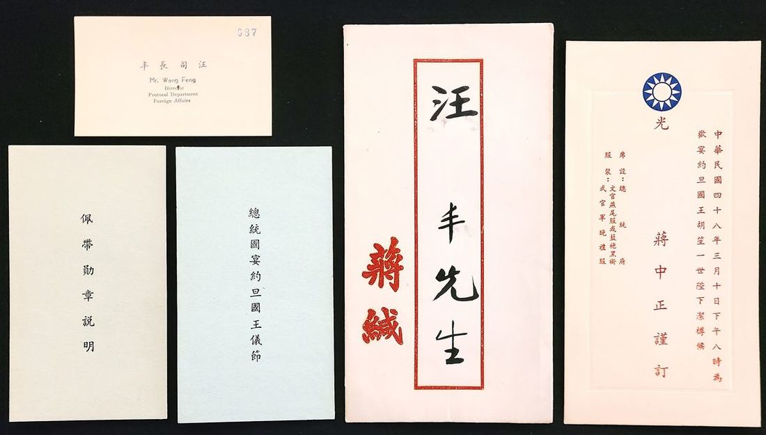1959 The King of Jordan visits Taiwan, and President Chiang Kai-shek holds a state banquet for this occasion. The invitation includes: Invitations, State Banquet Protocol Booklet, Business cards for guest introduction and the instruction booklet on wearing the medal. Well preserved and rare.